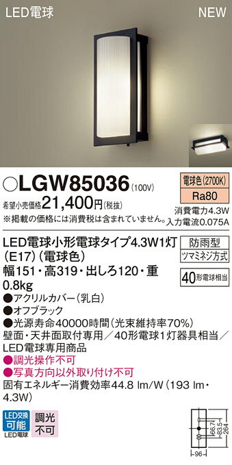 商 品 詳 細商品名パナソニック エクステリアライトメーカー名パナソニック Panasonicメーカー器具名称エクステリアライト ブラケットライト ポーチライト仕様◆LED電球小形電球タイプ4.3W1灯(E17)(電球色) ◆色温度:2700 K ◆光源寿命40000時間(光束維持率70%)◆幅:151 mm ◆高:319 mm ◆出しろ:120 mm ◆質量:0.8 kg◆器具光束:193 lm ◆電圧:100 V ◆消費電力:4.3 W ◆消費効率:44.8 lm/W◆デザイン分類:Stylish Modern◆【アクリルカバー】乳白◆Ra80◆40形電球1灯器具相当◆壁面・天井面取付専用◆LED電球専用商品◆入力電流(100V時):0.08 A◆調光操作不可◆写真方向以外取り付け不可注意事項◆調光操作不可 ◆写真方向以外取り付け不可 ※施工・電気工事は専門業者にご依頼ください。