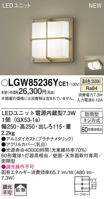 エクステリア 屋外 照明 ライト パナソニック(Panasonic)ポーチライトLGW85236YCE1 プラチナメタリック 温白色 天井直付型・壁直付型LED(温白色)拡散タイプ・密閉型 防雨型 白熱電球60形1灯