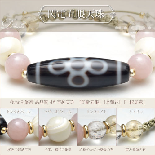 天珠・天然石の サイズ ・閃電五眼天珠 38mm×12mm ・水蓮花天珠 38mm×12mm ・二眼如意天珠 38mm×12mm ・ピンクオパール 10mm ・マザーオブパール 12mm ・クンツァイト 8mm ・シトリン 8mm ・ねじれ水晶 6mm ・ロンデル 重さ 約25g 天珠のランク 4Aランク至純天珠を使用。