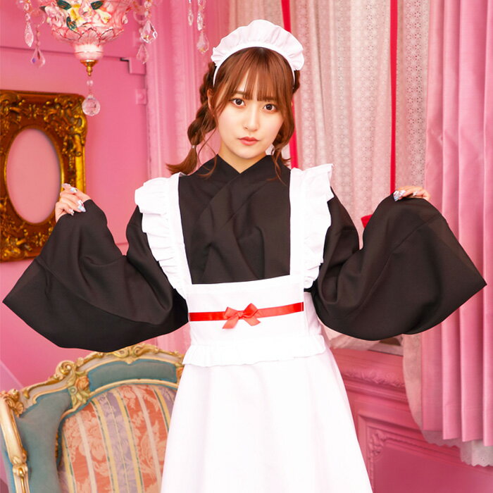 送料無料 和風メイド 着物 和服 和装 メイド服 ブラック 黒 ホワイト エプロン メイド衣装 袴 作務衣 メイド ミニ スカート カチューシャ ワンピース セット 一式 ウェイトレス かわいい セクシー メイドコス コスチューム コス ハロウィン コスプレ 仮装 衣装 s-cs-6j811